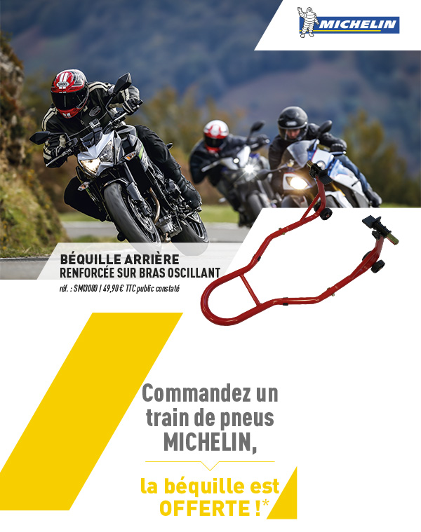 * offre valable du 13 février au 31 mars 2017, pour tout achat d’un train de pneus MICHELIN parmi les gammes MICHELIN PILOT ROAD 4, MICHELIN PILOT ROAD 4 GT et MICHELIN POWER RS, la béquille SMI3000 est offerte (valeur TTC indicative : 49,90€).