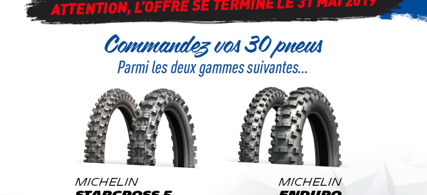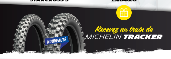 * De février à mai 2019, commandez 30 pneus Michelin parmi les gammes TT proposées, nous vous offrons un train du nouveau Michelin TRACKER à tester chez vous.